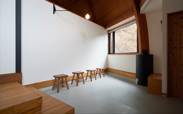 プラネタリウムのような丸い屋根や、大広間と区切られた白壁のホールスペースが特徴的。