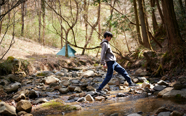 森林公園内を流れる「鳴子川」は園のシンボル。渓流は一年を通して水量が少なく水深が浅いため、子どもたちのあそび場にぴったり。バーベキュー・デイキャンプサイトやテントサイトのすぐ真横を流れる川だから、大人の目の届く範囲で、子どもたちがのびのびと渓流あそびを楽しむことができます。